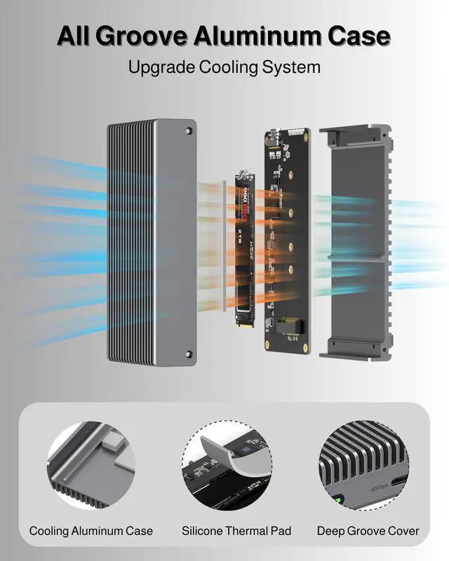 Thunderbolt Nvme Enclsoure Cooling: Sunch USB 4 Nvme Enclosure with all rugged aluminum case construction enclosures and large inner space help dissipate heat efficiently, keeping the SSD cool during intensive tasks. While come with built-in heat sinks and thermal pads to further enhance cooling and prevent overheating. High-quality materials adopted and build ensure the SSD reader is durable and reliable for long-term use. ^^ Rugged Aluminum and