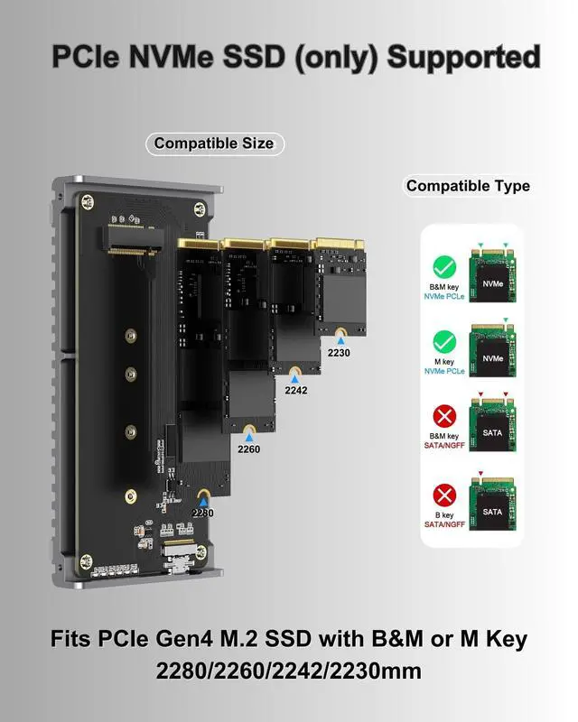 Capacity: The 40Gbps M. 2 Nvme SSD Enclosure is just Plug and play with no driver installation required. The SSD external enclosure is the preferred choice for gamers, video editors, photographers, and office workers. It supports M/B+M key NVMe solid-state drives with a maximum capacity of 8TB capacity in size of 2280/2260/2242/2230mm(Note: It does not support SATA NGFF solid-state drives or mSATA solid-state drives), fix Windows/Mac OS/Linux/Android systems. ^^ High Quality with