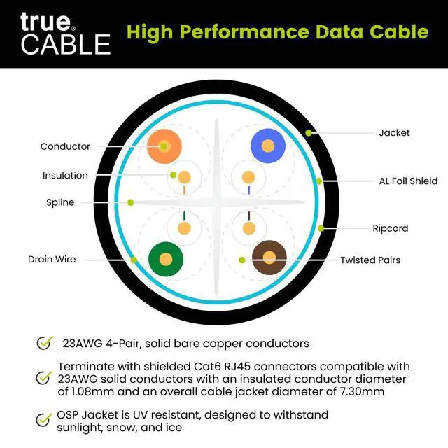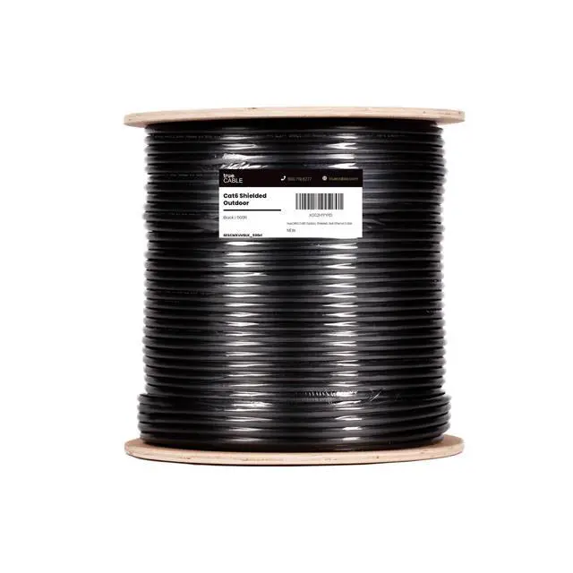 Supports Power over Ethernet: PoE/PoE+/PoE++ (IEEE 802.3 af/at/bt) 4PPoE up to 100W. ^^ [Hassle Free Packaging] 500 feet (152 meters) comes conveniently pre-spooled on a tangle free, easy pull reel so you dont have to worry about getting behind on your next job. ^^ [Solid Bare Copper Conductors] Pure bare copper conductors offer superior signal strength, conductivity, and flexibility compared to cheaper copper clad aluminum (CCA) options. Choose pure copper for a stronger, more reliable connection. ^^ [For Use Outdoors] UV resistant, OSP jacket designed to withstand sunlight, snow, and ice. Perfect for above ground applications. Rugged and durable for the great outdoors. Not rated for direct burial. ^^ [ Field Tested, Customer Approved] Our data cables have been tested with a Fluke DSX-8000 Versiv CableAnalyzer and comply with ANSI/TIA 568.2 -E standards, RoHS-3 compliant. Backed by our outstanding customer support.