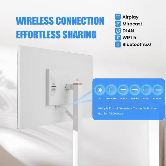 ^^ Diverse Smart ConnectionsThis 32-inch rolling TV and mobile smart screen support both wireless casting and wired connections. Wireless casting is compatible with Android, iOS, Mac, and Windows systems, enabling effortless content sync from phones, tablets, and laptops. Equipped with rich interfaces including HDMI, Type-C, and USB 3.0, it ensures smooth wireless sharing and stable wired connectivity, facilitating seamless multi-screen streaming. You can easily share your favorite videos, office files, and more with those around you, enjoying an immersive and hassle-free viewing experience anytime.
