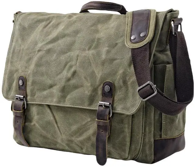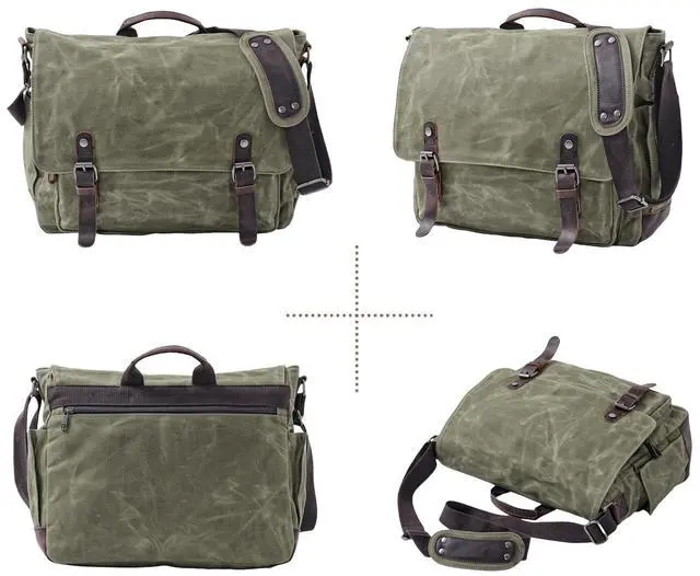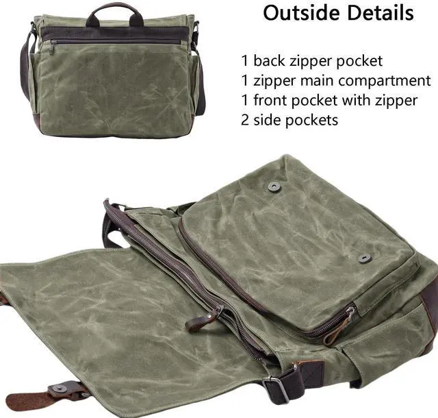 MATERIAL - Made of oilcloths ( waxed high-density canvas) combined Top-grain crazy leather accessories, Reinforced stitching at all stress points with wrapped binding ensures long-lasting performance. create a distinctive, adventure-ready crossbody bag. ^^ DIMENSIONS - The external dimension of this canvas bag is 15.7 x 12.6 x 5.1 in, allowing 1-2cm error. Item weighs 2.9 lbs ( 1.3 kg); It is a messenger bag which is good for daily, college, business, overnight, etc.