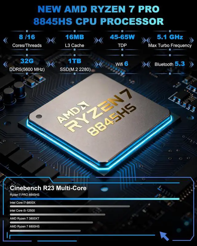 ^^ AI-Ready Mini PC: NPU with 16 TOPSStep into the future of computing with the groundbreaking AMD Ryzen 7 8845HS processor. Its integrated NPU delivers up to 16 TOPS of AI processing power, making this mini pc Ryzen 7 uniquely capable for AI-driven tasks like voice recognition, image processing, and smart background effects in video calls, all while handling demanding games and creative software with ease.