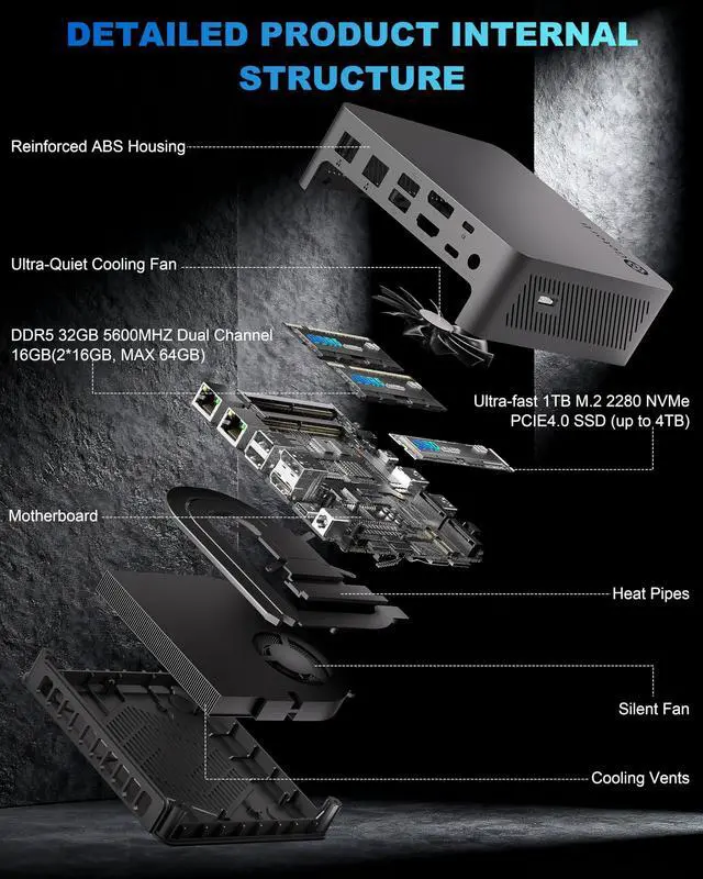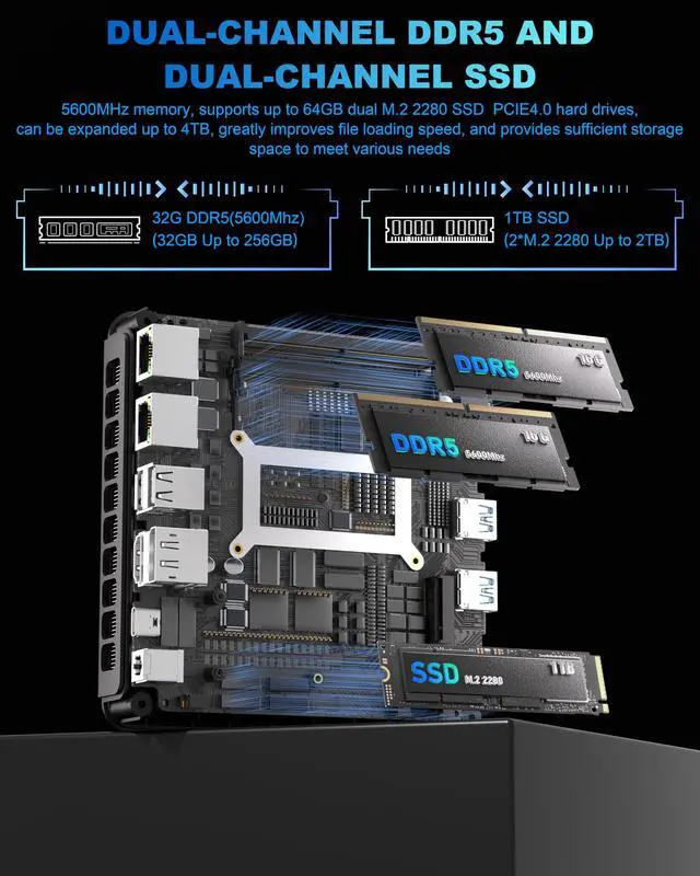 This comprehensive suite of ports ensures your multi-display workflow for trading, development, and design remains seamless, connected, and completely uncluttered. ^^ High-Speed, Expandable MemoryGet started immediately with a 32GB of blazing-fast DDR5 RAM (expandable to 256GB) and a 1TB PCIe 4.0 SSD (upgradable to 4TB). This mini computer ensures instantaneous load times and ample space for large files, making it well-suited for intensive multitasking and large project libraries. ^^ Advanced Triple-Pipe CoolingOur advanced triple-copper-pipe cooling system ensures this powerful micro computer maintains peak clock speeds during extended AI computing and gaming sessions.