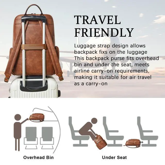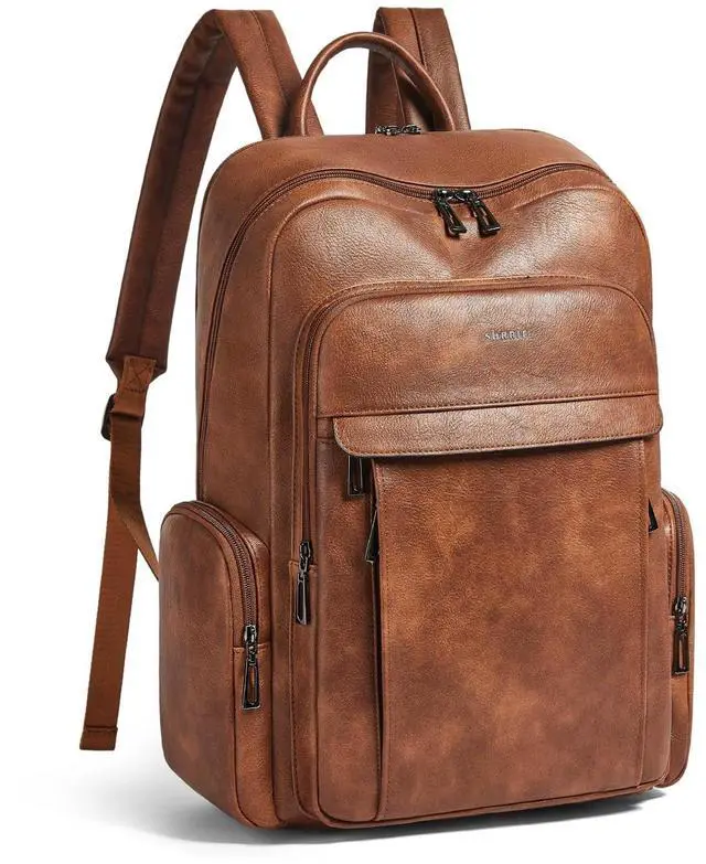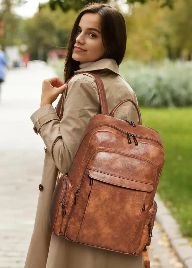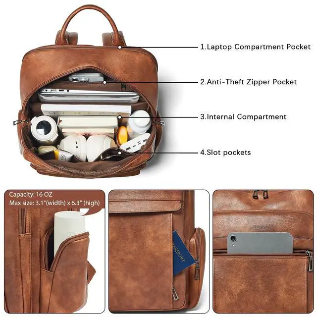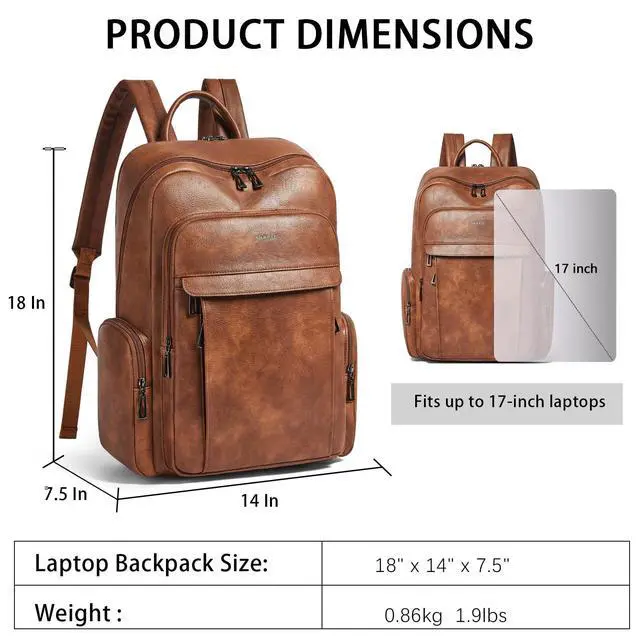 Premium Materials: Our leather laptop backpack is crafted from soft, durable faux leather and lined with abrasion-resistant fabric. To ensure exceptional quality and durability, this leather backpack features reinforced stitching, gunmetal hardware, thickened, pressure-relieving, adjustable shoulder straps and durable zippers. Its simple yet elegant design complements any outfit. ^^ Multi-Compartment DesignThis travel backpack with 11 pockets, the main double-zippered compartment features an inner zipped pocket, two slip pockets and a padded for electronics. On the outside, there is a laptop compartment zipped pockets, two front zipped pockets, two side zipped pockets and two concealed zipped pockets. There is ample space for your laptop, mobile phones, books, iPads, A4 documents, umbrellas, power bank, glasses, cosmetics and clothing.