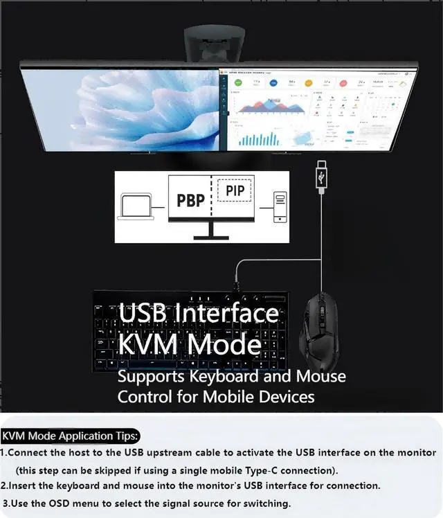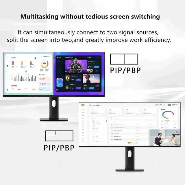 (Note: Up to 165Hz refresh rate is supported only via DisplayPort (DP). FreeSync must be enabled in the OSD menu. ). ^^ 2. USB-C 65W One-Cable Connection USB-C delivers video, audio, data, and 65W power delivery to your laptop simultaneously. One cable powers your MacBook/Windows laptop and keeps your desk clean without extra adapters. ^^ 3. Built-in USB 3.0 Hub + KVM Switch Features 2 USB-A 3.0 and 1 USB-B ports, allowing the 34 inch monitor to act as a full USB hub. The KVM switch lets you use one keyboard and mouse to control two devices, perfect for dual-computer workflows. ^^ 4. HDMI 2.0 + DP 1.4 Full Connectivity Equipped with HDMI 2.0 and DP 1.4 ports for stable output of 34401440 165Hz. Compatible with PC, Mac, PS5, Xbox, and other mainstream devices. ^^ 5. PBP/PIP Dual-Device Split Screen Supports PBP/PIP multi-source display, allowing you to view two devices at once. Great for programming + monitoring, gaming + streaming, or work + meeting setups. (If you have any questions about adjusting the monitor settings, please reach out to us via Buyer-Seller Messaging.