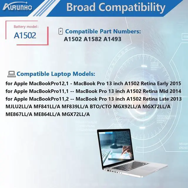 Color: Black. 100% brand New from Manufacturer. ^^ MacBook Pro 13" Late 2013 to Early 2015 A1502 Modelsfor MacBook Pro A1502 (Retina, 13-inch, Late 2013), MacBook Pro (Retina, 13-inch, Mid 2014), MacBook Pro (Retina, 13-inch, Early 2015) series. ^^ Macbook pro retina 13-inch battery Compatible P/NA1582, A1502, A1493, EMC 2835 2875, ME864xx/A, ME865xx/A, ME866xx/A, MGX72xx/A, MGX82xx/A, MGX92xx/A, MF839xx/A, MF840xx/A, MF841xx/A, MF843xx/A ^^ SecurityALL of our battery is CE, FCC, RoHS Certified. And have passed a series tests of short circuit, overheating, and overload protection before shipments for safety. ^^ AURUNHO After-sales We guarantee 30 days money-back and 12-month warranty; 24 x 7 email support. For any battery questions you fell free to contact us via "Your Orders" tab in your account, we will be glad to help you within 24 hours.