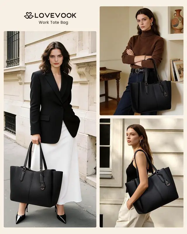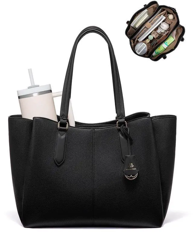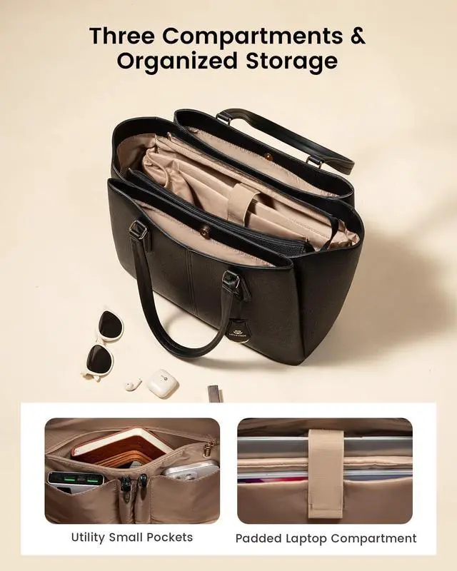 ORGANIZED TRIPLE COMPARTMENTS & SELF-STANDING Stop digging through a single disorganized space. Our laptop tote features a unique 3-layer structure with 2 magnetic side pockets and a central zippered laptop sleeve. The reinforced bottom-shaped design ensures the bag stands upright even when fully loaded, maintaining its elegant professional silhouette ^^ EXCLUSIVE 40 OZ TUMBLER POCKET Designed for the modern commuter, the interior features a specialized elastic water bottle pocket. It securely holds large bottles with handles, specifically tested for the tumbler 40 OZ, keeping your drink upright to prevent leaks while ensuring on-the-go hydration ^^ PADDED LAPTOP PROTECTION & SIZING Choose the perfect fit for your tech: our 15.6" size ( 17.3 x 5.7 x 13.1 in) or 17.3" size ( 18.3 x6x 13.9 in). Each bag includes a padded computer compartment and central zippered pocket to keep your laptop, tablet, and files secure and scratch-free during office hours or business travel ^^ WATER-RESISTANT MATERIAL & EASY CARE Crafted from high-density premium vegan leather (PU Leather) with a sturdy cotton lining. The water-resistant and scratch-resistant exterior is exceptionally easy to clean with a simple wipe, offering the luxury look of real leather with enhanced daily durability ^^ ERGONOMIC CARRYING & VERSATILE GIFT The 10.2" - 10.6" handle drop is ergonomically designed for comfortable shoulder carrying, making it ideal for teachers, nurses, and professionals. Featuring a stylish brand pendant, its a sophisticated gift for birthdays, Mothers Day, or Christmas. Designed to reduce commuter fatigue, the 15.6 version weighs only 2.2 lbs, while the 17.3 version is just 2.44 lbs