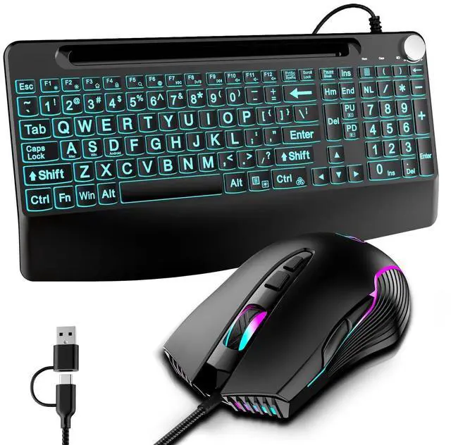 Lighted up Full Size USB C (Type C) /USB A Large Print Wired Keyboard and Mouse Combo, with 7 Colored Backlits &Phone Holder &Volume Knob&Wrist Rest &jiggler Mouse, for Macbook, Mac Windows Laptop PC