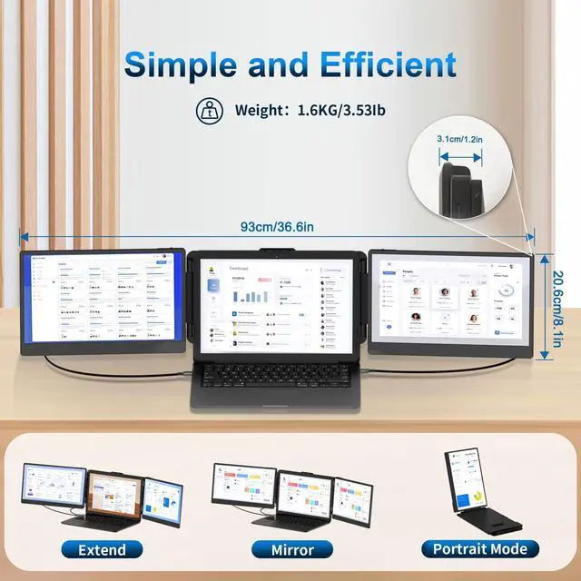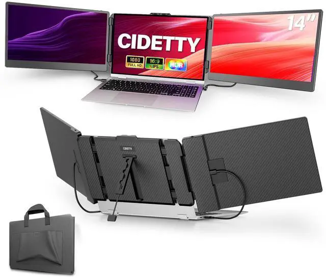 It can expand the screen space by up to two times, making multitasking easier with multiple display modes. It allows you to create a personal mobile workstation anytime, anywhere, and can increase work efficiency by up to 200%. ^^ Guarantee & Package CIDETTY dual screen laptop has gift package! High quality materials with QC. FCC, CE, RoHS certified. Each pack includes 1 screen, 2*Type-C cable, 1 HDMI to USB-C cable, 2*USB-A to USB-C power supply cable, 1 protective case, 1 NewbieQuick Guide, 1 instruction.