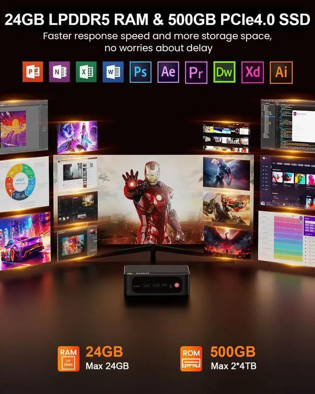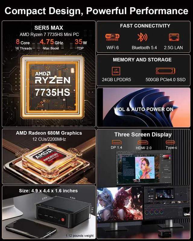 Gaming Recommendation: CSGO, Destiny2, GTA5, PUBG, DOTA 2, LOL ^^ 24GB LPDDR5 & 500GB PCIe 4.0 SSD SER5 MAX mini pc comes with 24GB LPDDR5 6300Mbps RAM & 500GB M. 2 2280 PCIe 4.0 x4 SSD (two SSD slots, max 4TB * 2, speed up to 7000MB/S, 2 times faster than PCIe 3.0 ). Large capacity helps to save more large programs in the computer and brings smoother operation of multi-tasking. High-speed SSD enables quicker load time of large files and high resolution content ^^ 4K UHDTriple DisplaySER5 MAX mini desktop computer supports triple screen display via 1*HDMI 2.0 (max 4K 60Hz) +1*DP 1.4 (max 4K 144Hz) +1*Type-C (max 4K 120Hz), which enables multi-task easily. You can also expand your viewing area across three monitors to enjoy better gaming experience ^^ Reliable & High-speed Connectivity Beelink Ryzen 7 mini pc features WiFi 6 and Bluetooth 5.4. WiFi 6 is up to 2.4 Gbps transmission speed, three times faster than WiFi5. Lower latency Bluetooth 5.4 offers more stable and efficient connections to multiple wireless devices such as projector, printer, speakers and etc. The mini pc is perfect for video conference, browsing, streaming, large file transfers, and online collaboration ^^ Meet Deeply Needs7735HS mini pc measures 4.9 x 4.4 x 1.6 inches, only 1/40th size of standard desktop pc, it's convenient to bring it for flexible working or hide it on the back of a monitor via the VESA mount.