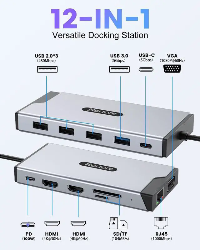 12-in-1 USB C Docking StationOne cable, seamless connectivity. This USB-C hub multiport adapter expands a single USB-C port into 2 HDMI, VGA, RJ45 Ethernet, 100W USB-C PD, USB-C data port, 2 USB 3.0, 2 USB 2.0, and an SD/TF card readeran all-in-one laptop docking station designed for daily productivity. ^^ Triple Display SupportThis docking station dual monitor supports triple external display setups on Windows systems using SST and MST modes, enabling expanded screen space via HDMI and VGA outputs, with resolutions up to 4K@60Hz when using a single display.