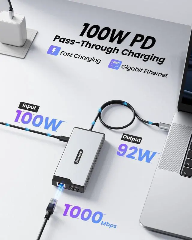 macOS supports mirror mode or extended mirror mode only. Multiple external displays will show the same content, and MST (Multi-Stream Transport) is not supported on macOS. Ideal for advanced multitasking and professional productivity environments. ^^ High-Speed Data TransferThe built-in USB-C hub features USB 3.0 ports (up to 5Gbps) for fast file transfers, USB 2.0 ports (480Mbps) for stable peripherals such as keyboards and mice, and an SD/TF card reader (up to 104MB/s) for quick photo and video access. ^^ 100W PD Charging & EthernetThis USB-C docking station supports up to 100W power input and delivers up to 92W output for safe laptop charging while in use.