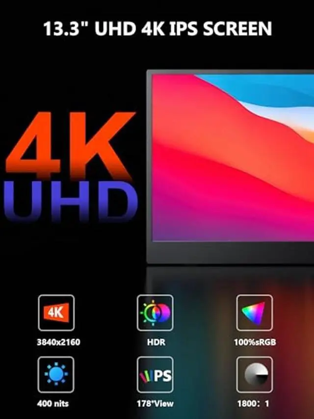 [ 13.3" Sleek Portable Monitor] This high-end 13.3 inch portable monitor features an ultra-narrow bezel, ultra-light weight and ultra-slim body. The design is clean and sleek, and the overall look adds a touch of sophistication, elegance and high-tech to your desk. This monitor is perfect for those who take their workspace and environment seriously. ^^ [4K Highest Resolution Screen] The 4K portable monitor equips spectacular IPS A-grade screen with 13.3 inch, 3840x2160 resolution, 400 nits brightness, 1500:1 contrast ratio, 100% sRGB, 178 degree wide viewing angle and 60 hz refresh rate.