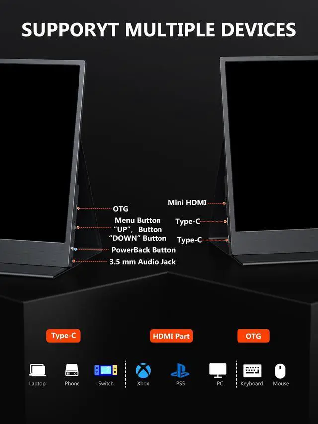 ^^ [VESA Mountable & 90Monitor Stand] The Portable Laptop Monitor has a 90-degree adjustable monitor stand and VESA mount holes (not included VESA mount) on the back. Standard 75x75mm VESA holes on the back allow you to mount the monitor to a desktop or wall and set it to landscape or portrait mode as desired. ^^ [Plug and Play, Ease to Use] This laptop expansion monitor offers 2 full-featured USB-C ports and 1 Mini-HDMI port, requiring only a USB-C cable (for devices with full-featured USB-C ports) or HDMI cable and power supply. Plug and play, power and signal transfer with just one full-featured type-c cable for easy and convenient operation.