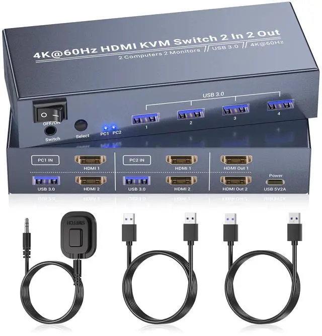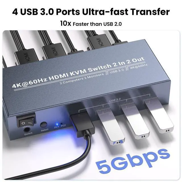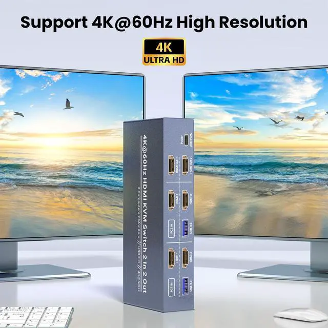 Stunning 4K@60Hz Ultra HD VisualsExperience crisp, vibrant imagery with this KVM switchs support for up to 4K (3840x2160) resolution at 60Hz. Whether you are editing documents, streaming content, or gaming, every detail stays sharp, and motion remains smoothno lag, blurriness, or pixel distortion. Its designed for anyone who demands high-definition visuals for work or play. ^^ 4 USB 3.0 Ports for Peripheral SharingEquipped with 4 USB 3.0 Type-A ports, this KVM switch 2 monitors 2 computers lets you share essential peripherals between your two computersthink printers, scanners, external hard drives, or even additional USB devices.