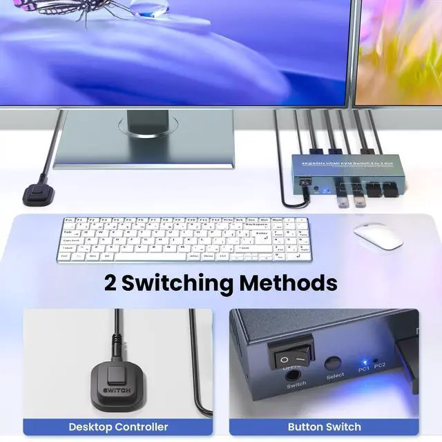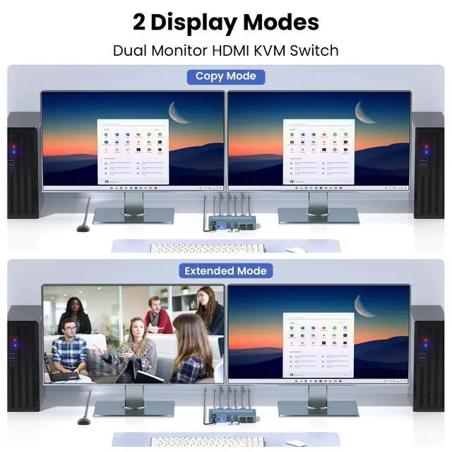 Note: This KVM switch does not support hotkey switching. ^^ Universal Compatibility and Plug-and-Play SetupThis dual monitor KVM switch works seamlessly with a wide range of operating systems, including Windows, m-a-c OS, and Linuxno need to worry about compatibility issues with your existing devices. Its also built with HDMI 2.0 technology, ensuring backward compatibility with lower resolutions (like 2K or 1080p) for older monitors or graphics cards.