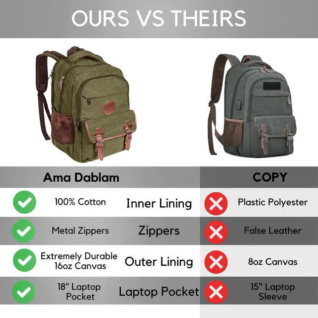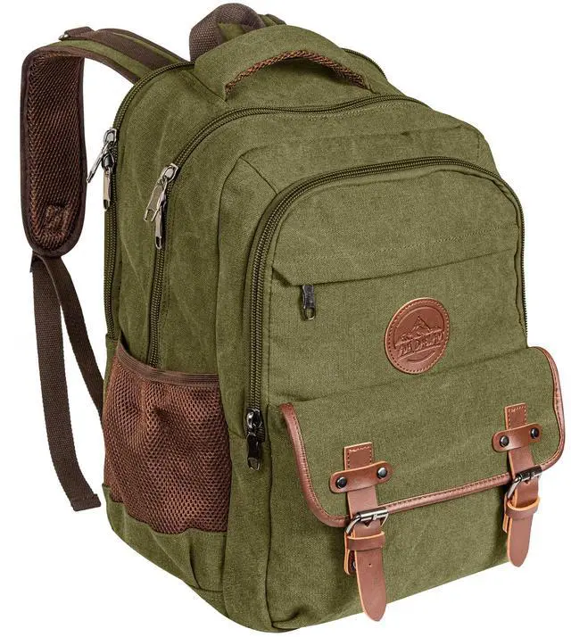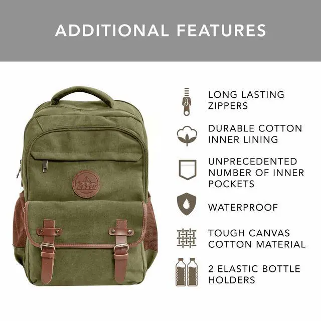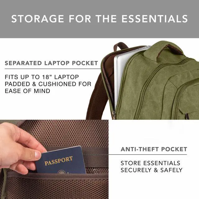 [Built for Durability/ Premium Quality] - Crafted from thick and tough 16oz canvas cotton, with durable zippers, premium stitching and sturdy cotton inner lining. Carry laptops, cameras, clothes, and gadgets with a premium feel and style. ^^ [Separate Laptop Sleeve & Ventilated Back] - Measures 18x12x7 with a 30L capacity. Features a padded sleeve for up to 17 laptops and breathable back and straps for added comfort. ^^ [Ample Storage Options] - Includes 2 side water bottle pockets, 1 front zipper pocket, 1 front button pouch, 2 large main compartments with a Separate padded laptop compartment, plus smaller interior pockets for pens and phones.
