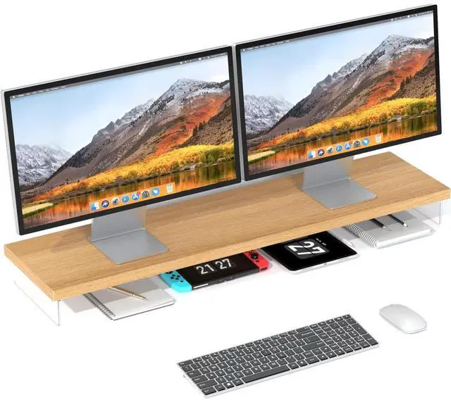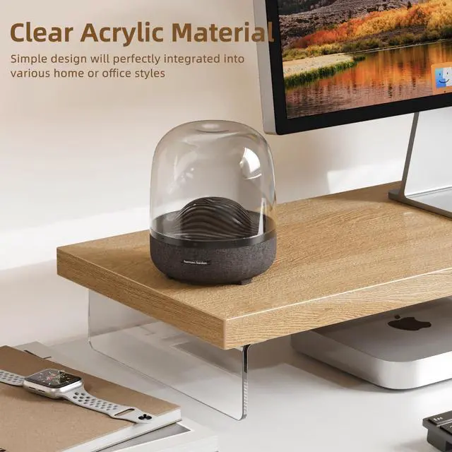 [Elegant Aesthetic Design] SSWOOD Desktop Organizer Stand combines natural wood grain with crystal-clear acrylic for 360 visible elegance, offering a modern and artistic touch to any workspace. The widened lower layer provides extra storage for keyboards, mice, and office supplies, enhancing both functionality and style. ^^ [Premium Durability] Computer monitor stand riser constructed with high-quality 1-inch solid wood and reinforced wood-acrylic hybrid structure, the stand supports up to 50kg/110lbs, making it 11% stronger than steel-embedded acrylic stands (45kg) and 42% sturdier than crystal-brick designs (35kg). Cross-jointed wood beams prevent warping, ensuring long-lasting stability.