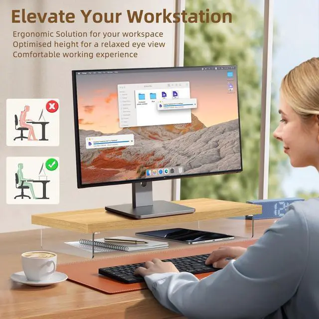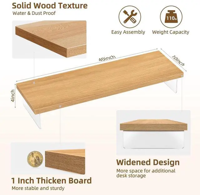 ^^ [Ergonomic Comfort] The monitor stand raises your monitor by 4 inches to align with eye level, reducing neck and back strain. The wooden construction offers an ideal viewing angle, maximizing productivity and comfort during long work sessions. ^^ [Effortless Assembly & Maintenance] This computer monitor stand come with pre-drilled holes, allow for quick and easy assembly in just 10 minutes, with no complex tools required. Available in 4 colors to match various decor styles. The smooth wood surface is dust-resistant and easy to clean with a damp cloth, making it suitable for both home and office use.