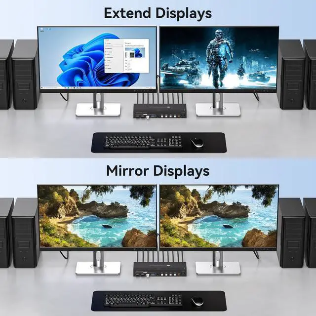 Duplicate Mode: Both monitors show identical content, meeting multitasking or synchronized display needs and easily adapting to office, design, monitoring, and other scenarios ^^ Two Switching ModesThe dual monitor kvm switch provides two switching modes: