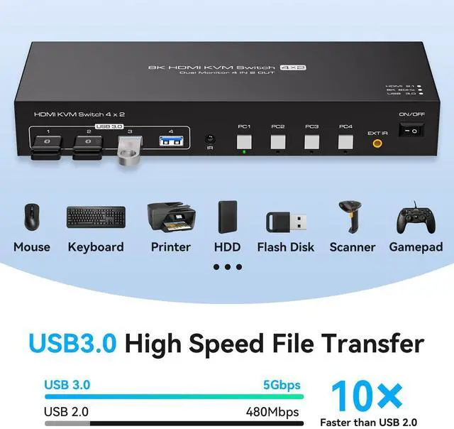 HDMI KVM Switch 4 PC Dual MonitorThe 4 port kvm switches allows 4 computers to share 2 displays and 4 USB 3.0 devices. Easily switch between the 4 computers using the remote control or switch buttons on the panel. Supports screen Copy and extension.