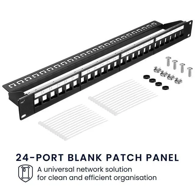 ^^ Cable Management: The patch panel comes with 24 cable ties and labelling fields, helping you keep your cables organized and easily identifiable. It also features a central earthing connection.