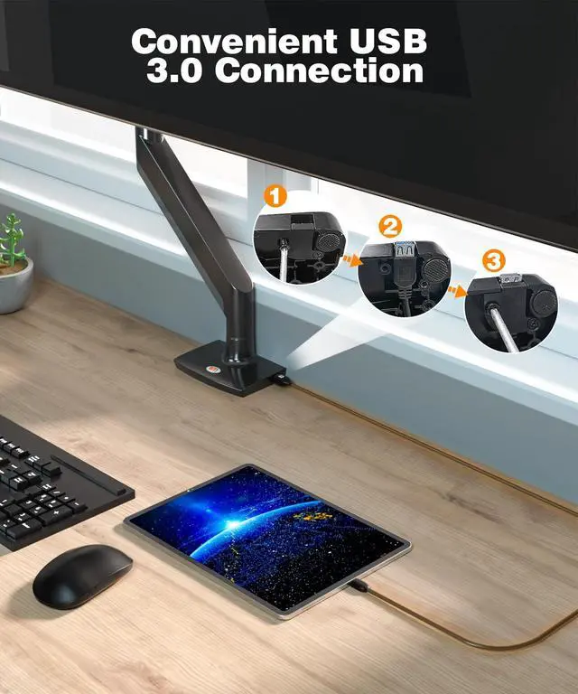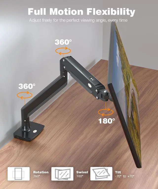 Desk Space: This desk mount monitor stand can be easily mounted via C-clamp (desk 0.39" - 3.54" thick) or grommet mounting (table hole size is8mm). Free up desk space and declutter your workspace efficiently ^^ Heavy Duty and