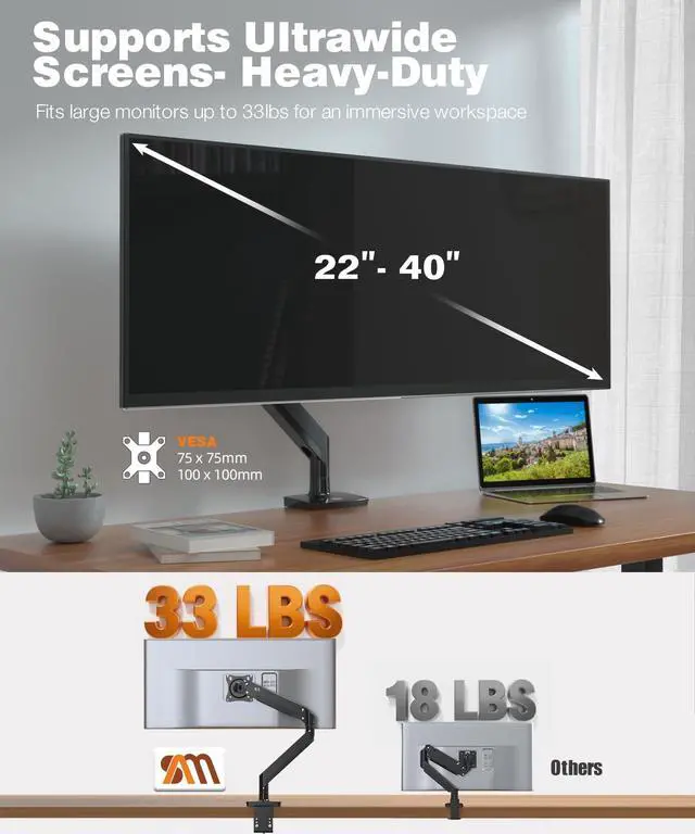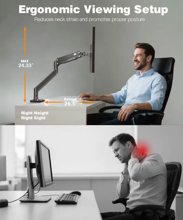 Universal Compatibility: This single monitor arm fits 22" to 43" LCD/LED screens, 33lbs max for flat and curved. This VESA monitor mount works with VESA 75x75mm / 100x100mm mounts. No hassle setup for home or office ^^