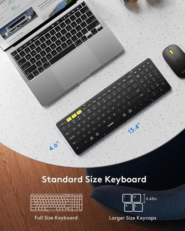 Full-size Foldable Keyboard and Mouse Samsers foldable keyboard is designed with standard size (unfolded size: 13.5 x 4.5 inch) and 0.63 inch standard keys, more in line with finger size and typing! Mouses contoured shape are designed to fit comfortably in your palm, enhanced tracking and precise cursor control keeps you in command and increases your productivity. ^^ Connect up to 3 Devices Samsers Foldable Bluetooth Keyboard Combo supports up to 3 devices simultaneously. One tiny 2.4G USB receiver+Bluetooth 5.0 X 2. Equipped with the latest 5.0 Bluetooth chip, Youll get a stable connect and switch without delay or dropout! Compatible with Windows, Mac OS, iOS or Android, you can type, switch and continue typing on your devices! ^^ Folding Keyboard with Numeric KeypadStandard numeric keyboard facilitate quick calculation and numeric input. Richer and more practical multimedia shortcuts with fn lock function make your work more convenient and efficient! Built-in rechargeable battery can up to 90-120 days stand-by time after a 2-3 hour charge. One full charge is enough time for your short business trip or vacation! ^^ Portable Case & Big Convenience Samsers Foldable Keyboard and Mouse with Case, weighs only 21 ounces. Sturdy and stylish case organizes all your essentials neatly, including folding keyboard and mouse, phone holder, charging cable! Maximum convenience for you with minimum weight and size! Not just a keyboard, but a travel solution! ^^ Quiet Design & Adjustable DPI Silent scissor switch keys and non-slip PU leather bottom allow you to work with full concentration! Innovative seamless metal hinge design lets you get your own familiar layout! Smooth typing experience and precise cursor control make it a perfect match for tablet, phone, laptop and PC.