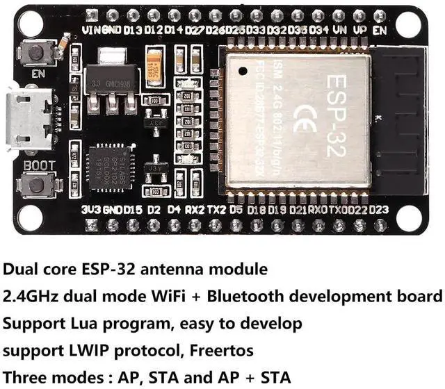 Dual core ESP-32 development board, 2.4GH z dual mode development board. There are two touch buttons, one is reset, the other is enable module to enter the halberd program mode. ^^ The module is ESP-WROOM-32 module, the peripheral uses the USB serial port chip CP2102 to expand the micro USB interface, which can be directly debugged by a USB connected computer, and the data transmission is fast and stable. ^^ ESP32 development board support lua program, easy to develop, support LWIP protocol, Freertos, three