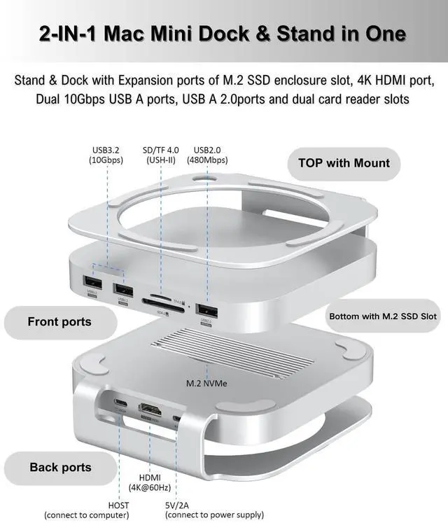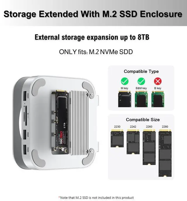 2 SSD Enclosure: This Mac Mini docking station is equipped with built-in Hard Drive enclosure, capable of running NVMe M. 2 SSD, Supports up to 8TB and most SSD sizes (M. 2 2230/2242/2260/2280) with blazing 10Gbps speeds for all your files and media. Which space to easily increase memory storage without adding clutter to your workspace.