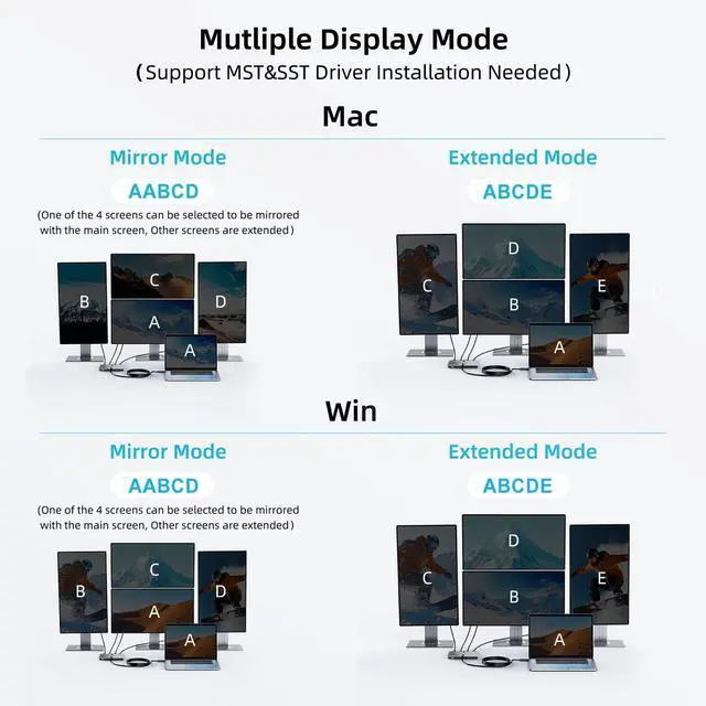 NOTE: This product requires downloading the driver, and switching to MacBook requires authorized screen recording before restarting to use. ChromeOS, Linux, Unix are not supported. Can't play HDCP-protected content on sites like Netflix, or Hulu. The USB port and HDMI port must be properly connected for normal operation. ^^ Driver Installation NeededDriver is must required before use this product, if you do not know how to install driver, Please refer to our details page or user manual for detailed tutorials OR please let us know and we will help you. ^^ 4K30Hz x2+1080P60Hz x2 Display USB 3.0 to HDMI Adapter for 4 monitors allows for effortless multitasking, mirror or extend a computer display workspace. Allows you to connect screens simultaneously 4K30Hz x2+1080P60Hz x2. You can do your work, play games, and more on the external UHD screen. ^^ Type C 3.0 PortTransfer Files in