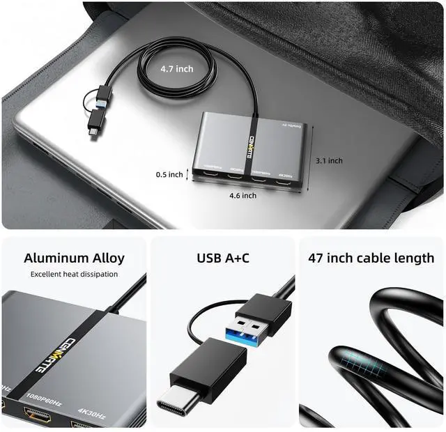 USB A/C to 4xHDMI AdapterUSB 3.0 to Multiple HDMI Adapter allows you to connect screens simultaneously 4K30Hz x2+1080P60Hz x2, supports mirror/extend mode.