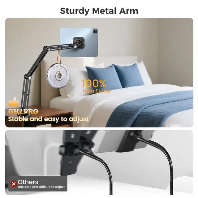 Ultra Strong Magnetic HolderFeatures a complete built-in MagSafe ring reinforced with 6 additional N55 neodymium magnets, providing a supremely secure magnetic grip for your tablet or phone. The included large metal ring allows non-magnetic devices to enjoy the same strong hold instantly. ^^ Robust Aluminum Construction & Permanent InstallationCrafted from high-grade aluminum alloy, this heavy-duty metal stand is built to last. Includes all hardware (8x M5 Screws, 4x Wall Anchors) for a secure, wall-mounted installation on wall, ceiling or cabinet (drilling tools required). ^^ Full 360 Adjustment & Space-Saving Foldable DesignThe wall mount features a 20mm ball head and a 3-stage arm that extends, offering perfect adjustable viewing angles in both portrait and landscape modes.