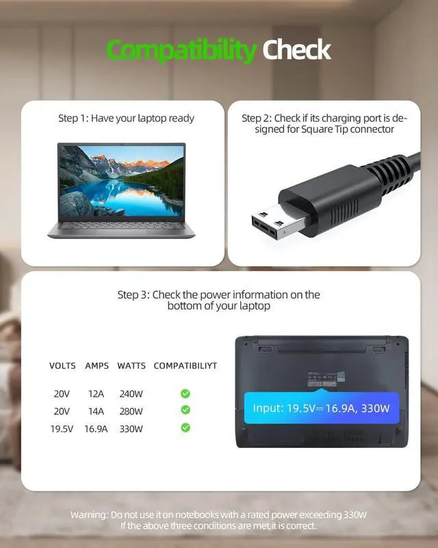 Safety - Passed stringent safety tests to ensure you and your devices' safety. ^^ Compatible with MSI GE76 GE67 Raider Leopard GP66 Vector GP76 HX 12UX CreatorPro X17 A12UX Laptop (Only for amperage equal or less than 16.92A ). ^^ Guarantee - Within 30 days of purchase, we offer a no-questions-asked replacement or full refund guarantee, 360 Days Warranty Guaranteed by the Manufacturer. ^^ Output Max - 19.5V 16.92A 330W (compatible with 280W) Input Volt Range - 100-240V ^^ Package - 1 * power adapter, 1 * AC Power Cord.