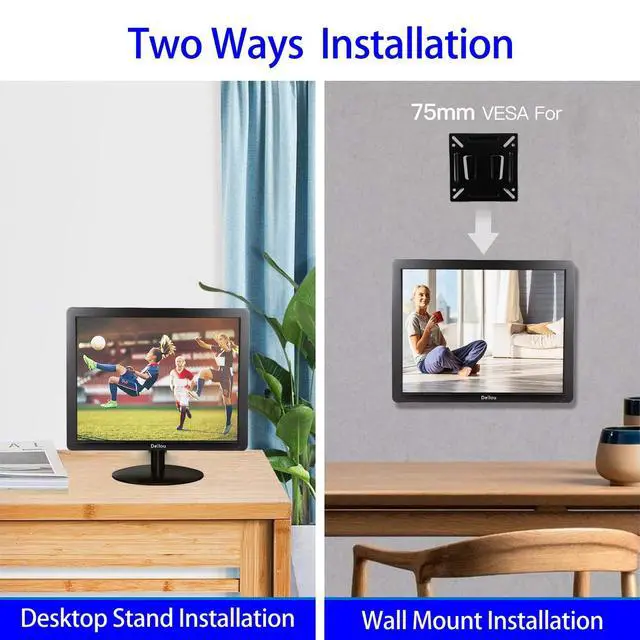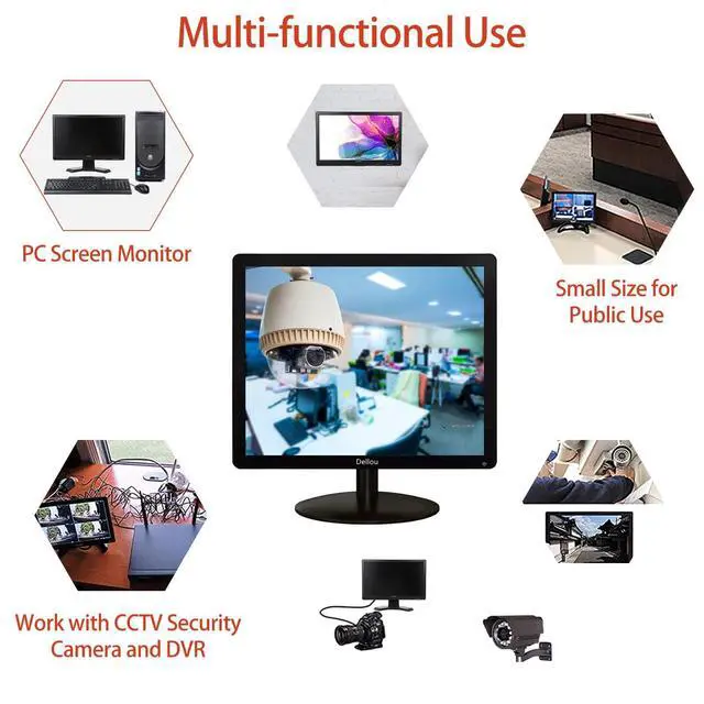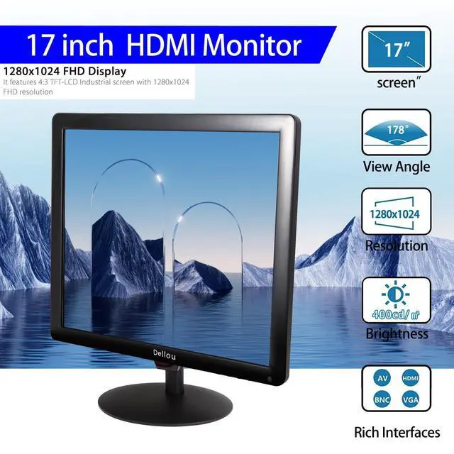 Specification size: Display length 365mm/ 14.4 inches, without base height 310mm/ 12.2 nches, with base height 385mm/ 15.2 inchesThis monitor screen is suitable for home, office, warehouse, convenience store, hospital, clinic, supermarket, etc. This monitor features HDMI, VGA, AV, USB, BNC, compatible with laptop, PC, PS3, PS4, etc., users can easily connect to other devices for even more You can enjoy it. Remote; VESA 75*75mm & built-in speaker. Support remote control to control this LCD monitor, and wall bracket can be used to mount it on the wall, making using this cute monitor more convenient and saving your time. Can be used as CCTV system, rear view camera, PC monitor, video recorder, notebook or monitor for indoor security use. Suitable for games, computer use, etc. What's included in the package. 1x17 type monitor1x remote control (batteries not included) 1x Wall mount1xHDMI cable1x power adapter1x User's Manual