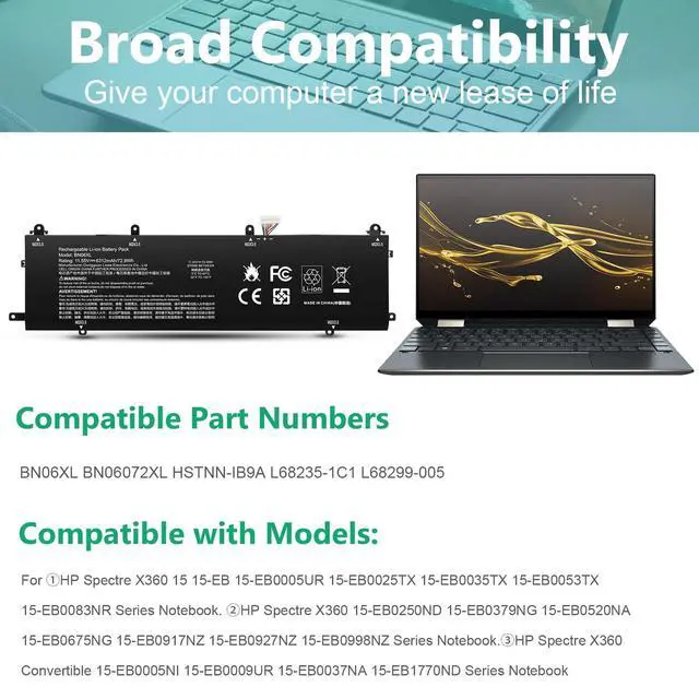 Cell: 6Cells; 100% brand new from manufacture. ^^ Compatible Part NumberBN06XL Battery for HP Spectre X360 Battery Replacement BN06XL BNO6XL BN06072XL HSTNN-IB9A L68235-1C1 L68299-005. ^^ Compatible Laptop ModelsFor HP Spectre X360 15 15-EB15-EB0005UR 15-EB0025TX 15-EB0035TX 15-EB0053TX 15-EB0083NR Series NotebookHP Spectre X360 15-EB0250ND 15-EB0379NG 15-EB0520NA 15-EB0675NG 15-EB0917NZ15-EB0927NZ 15-EB0998NZ Series NotebookHP Spectre X360 Convertible 15-EB0005NI 15-EB0009UR 15-EB0037NA 15-EB1770ND Series Notebook. ^^ All ASUNCELL Products are CE- RoHS- FCC- Certified and Built-in circuit protection ensure both safety and stability; Strict guidelines for compatibility, and standards compliance for environmental safety