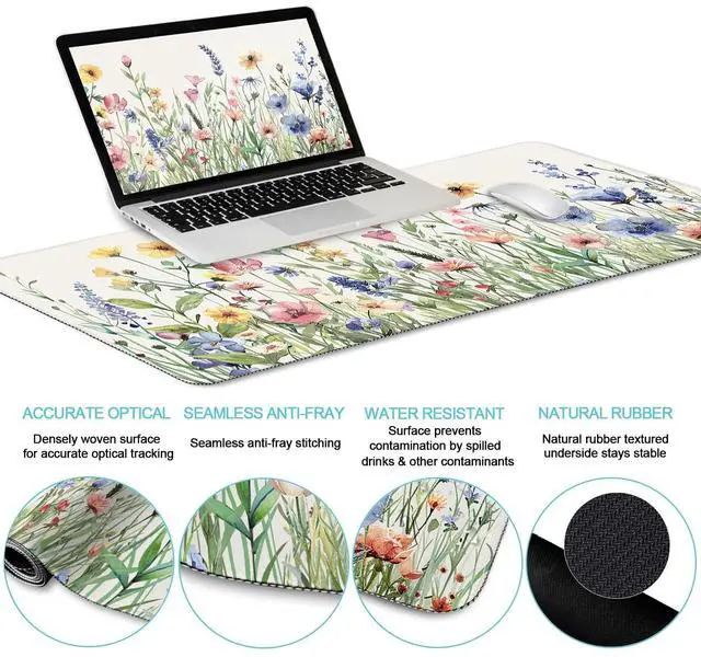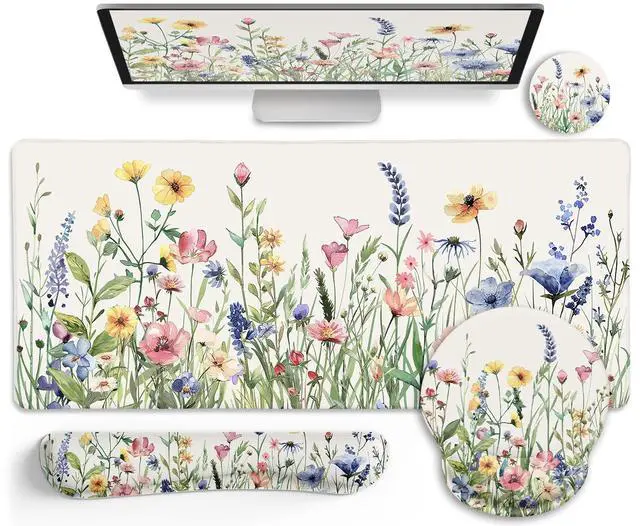 Mouse Pad Set: The cute flowers mouse pad set includes large desk mat ( 35.415. 7inch), mouse pad with wrist rest( 9.8 x 8.6 inch), keyboard wrist rest ( 17.3 x 3.15 inch), cup coaster ( 3.9" x 3.9" ). The long extended desk pad fits almost full-size keyboards and mice, providing plenty of space for gaming or office work ^^
