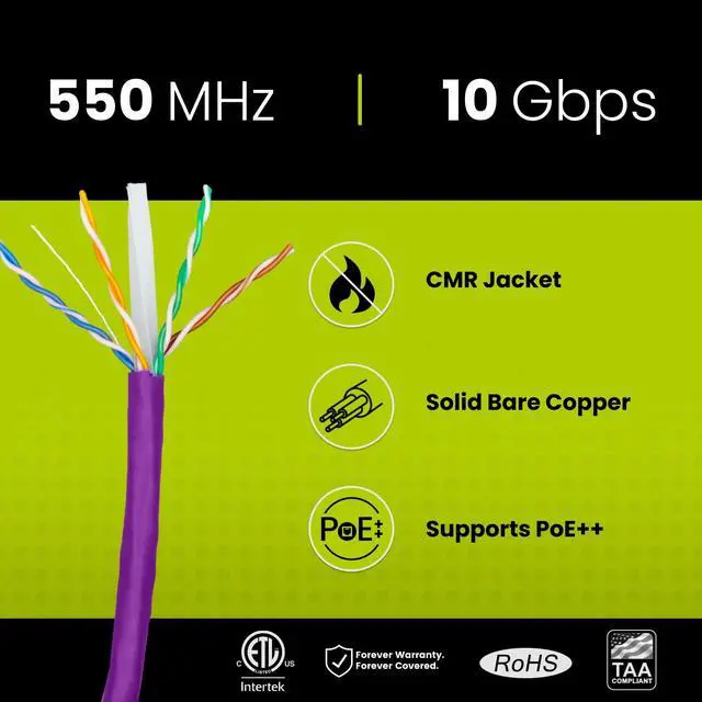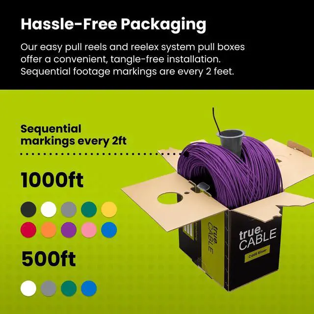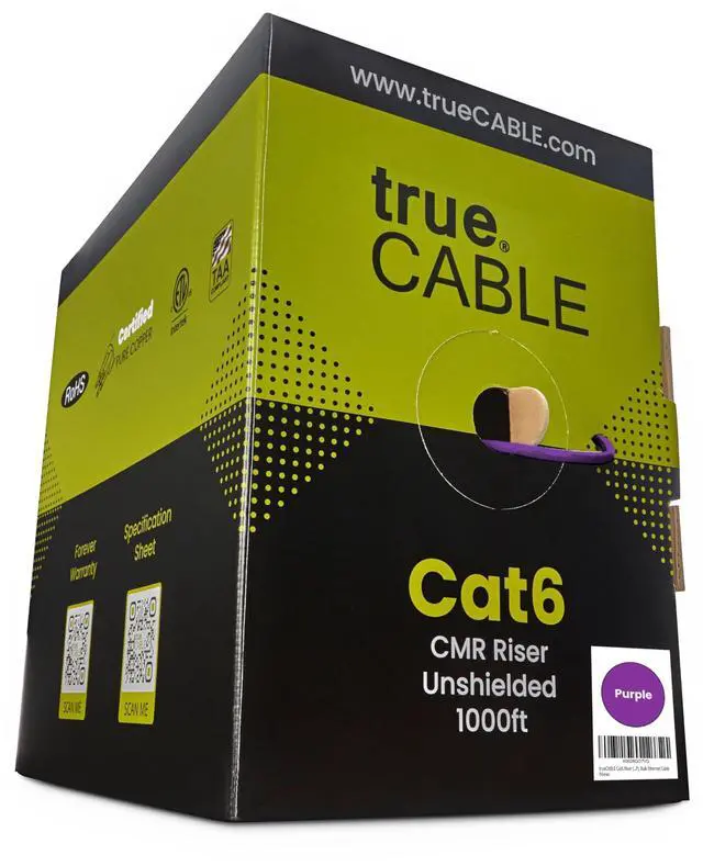 Supports Power over Ethernet: PoE/PoE+/PoE++ (IEEE 802.3 af/at/bt) 4PPoE up to 100W. ^^ [Hassle Free Packaging] 1000 feet (305 meters) comes conveniently pre-spooled in a tangle free, easy pull box so you dont have to worry about getting behind on your next job. ^^ [Solid Bare Copper Conductors] Pure bare copper conductors offer superior signal strength, conductivity, and flexibility compared to cheaper copper clad aluminum (CCA) options. Choose pure copper for a stronger, more reliable connection. ^^ [For Use Indoors] The purple riser rated jacket is for use in between floors, in wall, and non-plenum spaces. Help fires from spreading floor to floor in vertical installations with mild flame retardance. ^^ [ Certified by trueCABLE] Our data cables have been tested with a DSX-8000 Versiv CableAnalyzer and are in compliance with ANSI/TIA 568.2 -D standards, RoHS-3 compliant, and cETLus certified. Backed by our FOREVER WARRANTY. Compatibility & performance tested with trueCABLE RJ45 Connectors - B07Y3DDLGW and B088KWF9CW.