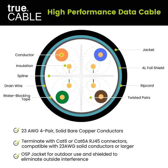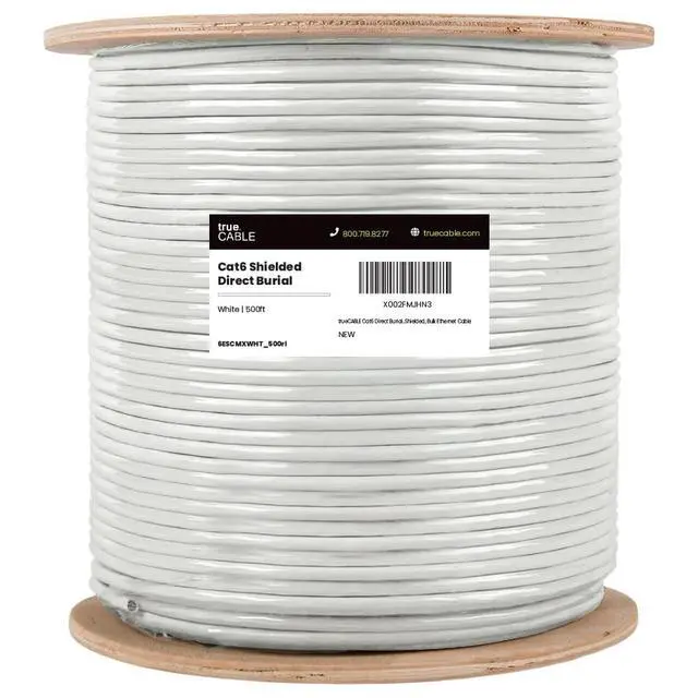 Supports Power over Ethernet: PoE/PoE+/PoE++ (IEEE 802.3 af/at/bt) 4PPoE up to 100W. ^^ [Versatile] Direct burial outdoor Cat6 cable with UV-resistant, OSP jacket. Built to withstand sunlight, dirt, snow, and moisture. Install in the ground, conduit, or outdoors for home or business networks. ^^ [Easy to Use] Pre-spooled on a tangle-free reel with xxxxft of cable for easy, smooth pulls, saving you time and effort on every project, whether youre a professional or DIY user. ^^ [ Field Tested, Customer Approved] Our Cat6 Direct Burial Shielded Ethernet Cables have been performance tested with a Fluke DSX-8000 Versiv CableAnalyzer and are in compliance with ANSI/TIA 568.2 -E standards. Trusted by installers for reliable performance. Backed by our outstanding customer support.