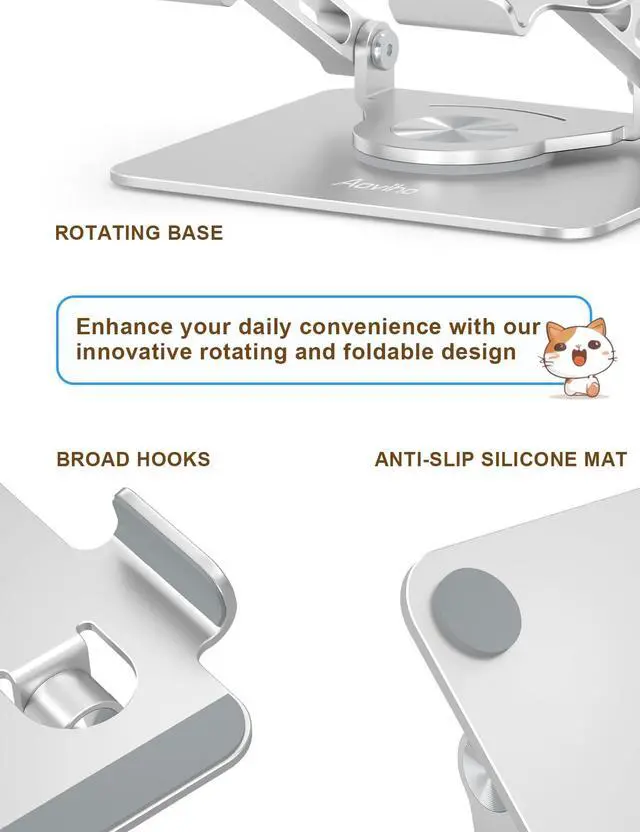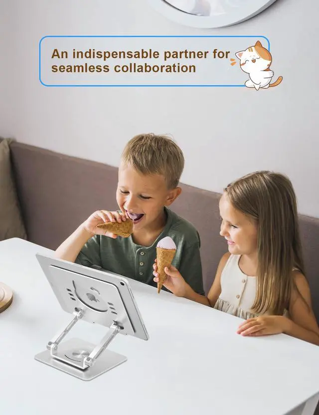 360 Rotation & Adjustable HeightThis tablet stand supports smooth 360 rotation with adjustable height and angles. Easily switch between portrait and landscape modes to keep your screen at a comfortable eye level and reduce neck, shoulder, and back strain during long desk or home use. ^^ Cute Cat Design & Gift-ReadyFeaturing a cute cat-inspired panel, this stand is especially appealing to cat lovers. The cat-shaped design helps improve heat dissipation and allows charging while in use. A practical gift choice for birthdays, Christmas, Mothers Day, Fathers Day, graduations, housewarmings, or back-to-school.