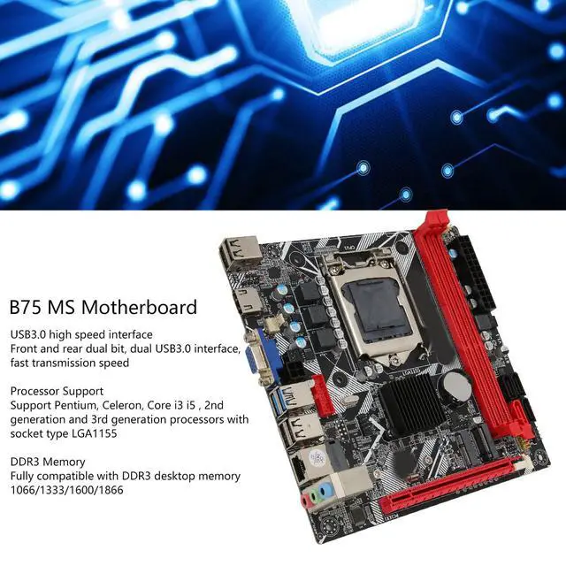 Description: The B75 MS LGA 1155 Motherboard supports 2nd and 3rd generation Core i3, i5, and i7 processors for consistent computing performance. It features DDR3 dual memory slots (up to 16GB), USB 3.0 ports for fast data transfer, and SATA 3.0 plus NVMe M. 2 interfaces for SSD expansion. With VGA and HDMI outputs, it supports HD graphics display. Compact and efficient, this motherboard is suitable for gaming PCs, office setups, and general desktop builds.