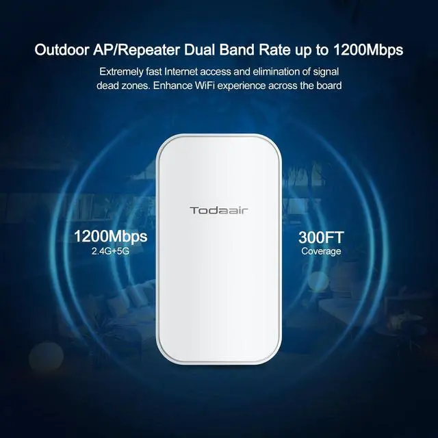 Dual-Frequency High-Speed TransmissionTODAAIR AC1200 outdoor wifi extender supports dual bands of 2.4GH z/300Mbps and 5GHz/867Mbps, ensuring a stable network connection in complex environments. ^^ Intelligent Reset, Automatic RecoveryIf The Repeater Encounters Any Faults Or Abnormalities During Operation, The Watchdog Function Will Immediately Trigger The Intelligent Reset Mechanism. This Means That Without Manual Intervention, The Repeater Can Automatically Restart And Restore To Normal Working Condition, Ensuring That Your Network Connection And Data Transmission Are Always Smooth And Unobstructed. ^^ Supports 2 Working Modes TODAAIR wifi extender supports relay mode and access point mode.