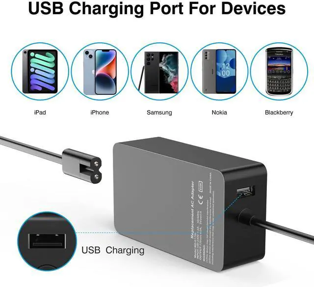 OUTPUT: 15V 4A 65W-Travel-friendly design The USB port allows you to charge another device such as your phone at the same time. -Strongest USB connecting wire that doesnt fray or breaks apart easily. -Ideal gift for anyone who owns an Microsoft