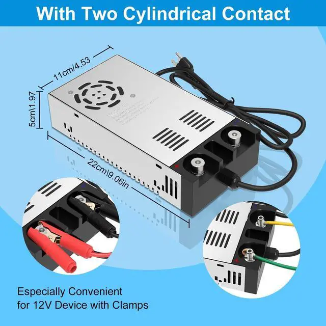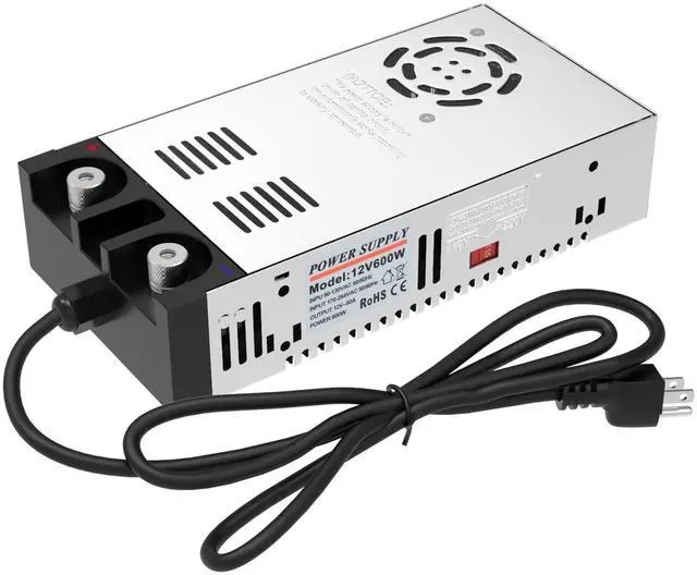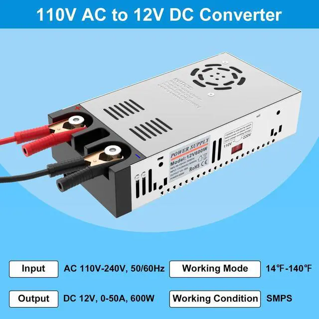 New Version ConverterAC to DC converter build with aluminum alloy shell, built-in wire integrated design, dual power connection methods, very convenient for 12V devices with clamps, all copper nickel-plated terminal material, which has good electrical conductivity and high conversion efficiency. ^^ Dual Input VoltageInput voltage support AC 110V-120V and 220V-240V. Output range (12V, 1A-5A/12W-60W ) or (12V, 10A-50A/120W-600W). Voltage input will adjust automatically to SMPS model, Output current mainly depends on your device, such as 10A/120W, 20A/240W, 30A/360W. Max current up to 50A, Power 600W.