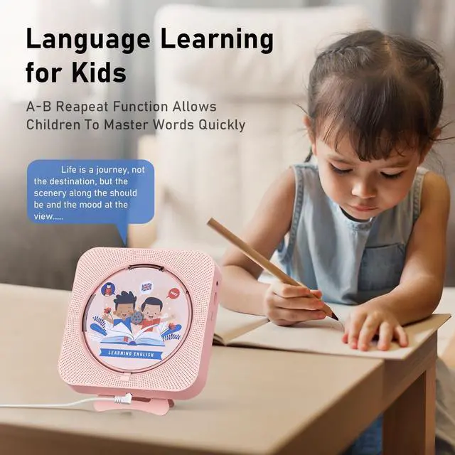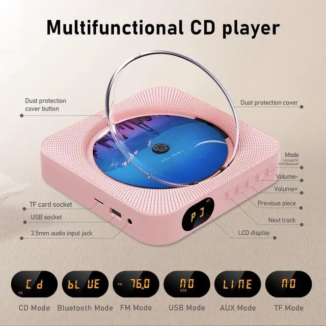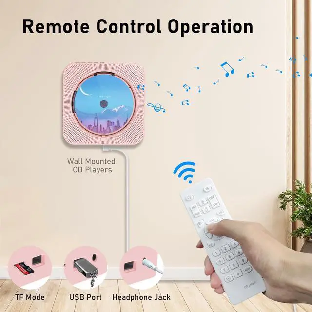 ^^ Wall & Desk CD Player There is a back mount on the home CD players so it will stand stability on the desk. It also can be mounted on the wall easily with the tool in the package, which is more space-saving. You can adjust it with remote control within 5m and set the timing switch, you can enjoy music freely. ^^ Unique Design Plug into electrical outlet, no need to wait, this CD player works immediately. The front dust cover on the desk CD player, which can effectively protect the disc from damages or dust.