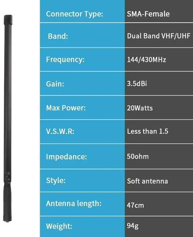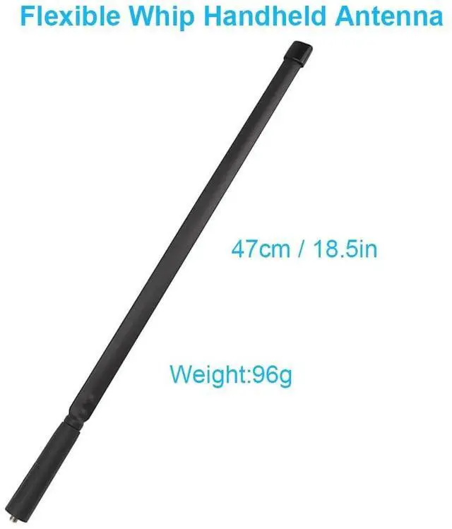 Tactical antenna frequency: 136-174MHz, 400-470MHz, length: 47cm/ 18.5 inch. ^^ Compatible with BaoFeng, Kenwood, Wouxun, HYT and other walkie-talkies. ^^ This CS Tactical Antenna length about 18.5 inch and is a must for outdoor and camping usage. This is a flexible antenna, easy to carry and instal, all while boosting the signal of your radio significantly! Extend the Range of your Communication. ^^ Dual band, can be bent, durable, elastic and tough. Two-way radio antennas are manufactured with durability in mind. The flexible and sturdy structure of the radio antenna allows the antenna to handle any situation at any time. ^^ The cs tactical antenna is resistant to folding and has a stronger signal, lightweight and easy to carry. Ham radio suitable for outdoor camping and self-driving tours. It is a good playmate for radio enthusiasts and tactical players.