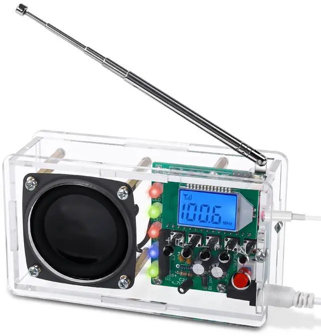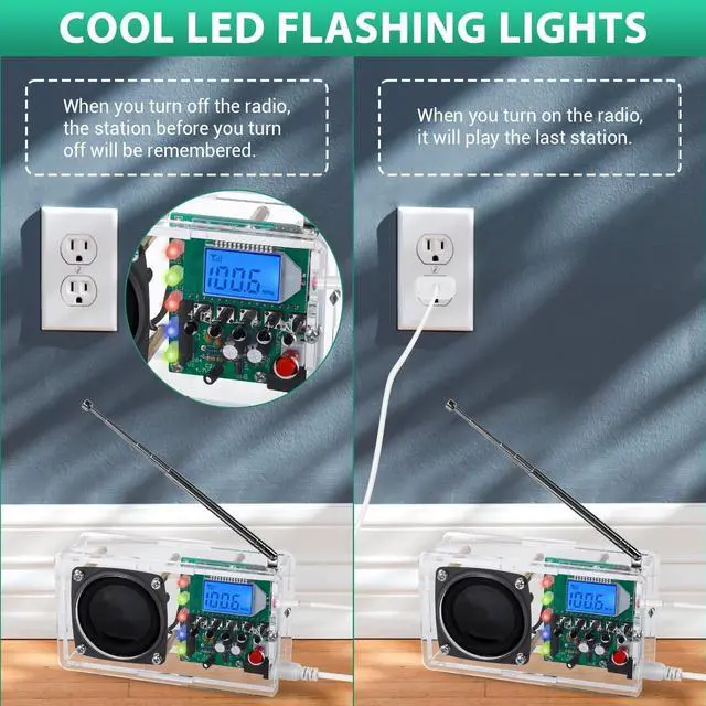 The LED lights will randomly flash different colors and pulse in sync with the beat of the music. This dynamic visual display enhances the overall ambiance and enjoyment of your radio listening experience. ^^ WITH A HEADPHONE JACKAfter assembling the radio, you will have a fully functional device with a headphone jack. This allows you to easily plug in your headphones and enjoy the channels in privacy without disturbing others around you. Whether you're tuning into your favorite talk show, catching up on the news, or simply enjoying some music, the headphone jack provides a personal listening experience that is suitable for any situation.