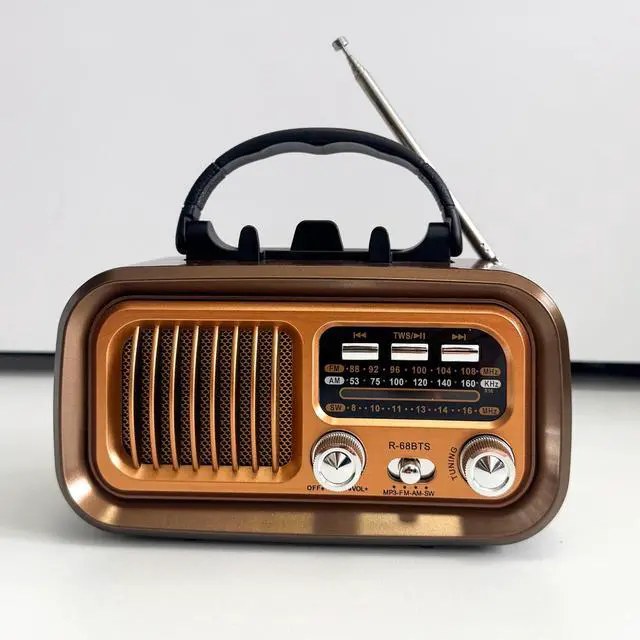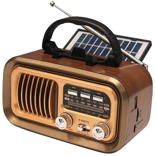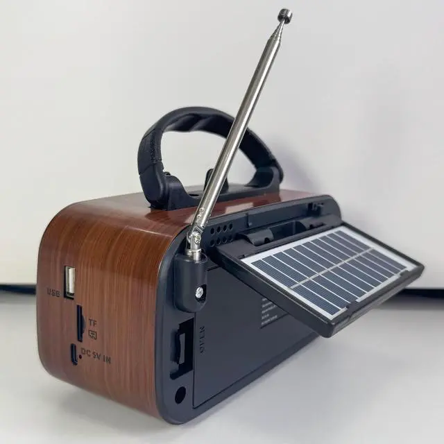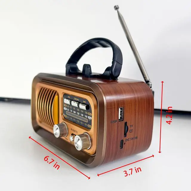 This retro radio offers 3 power sources: built-in 1200mAh battery (USB rechargeable), 2*D batteries (not included) for emergencies, and a high-efficiency solar panel, Higher charging efficiency and longer battery life ^^ Lightweight ( 0.73 lb) with a convenient carry handle ( 6.73. 74.2 in). Take it anywherefishing trips, outdoor adventures, or around the house, You can always enjoy endless wonderful fun from this small radio ^^ telescopic antenna for crystal-clear reception. Enjoy talk shows, weather updates, and music with enhanced sound quality ^^ Faux wood grain finish with intuitive analog knobseasy to use for all ages. Works as both a classic radio. Supports USB/TF card playback offline ^^ A thoughtful present for dads, seniors, or vintage enthusiasts. Combines nostalgic design with modern features like solar charging and wireless streamingperfect for Fathers Day, birthdays, or everyday use