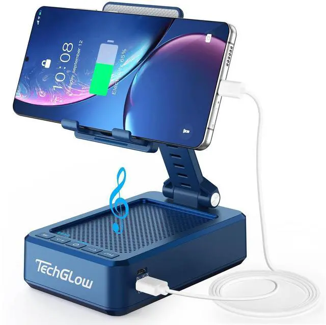 You can easily follow them step by step without holding the phone, hands free. ^^ Charging StandCharge your smartphone or tablet while watching videos or playing music with this Bluetooth speaker charging stand. No need to worry about your phone battery running out in the middle of having fun. It is also portable and easy to carry around. ^^ Works for smartphones and tablets 4-13"TechGlow phone stand speaker works with most 4-13" smartphones and tablets with Bluetooth function. It can also be used as laptop or computer outer speaker with AUX connection. ^^ Extra Long Battery LifePlaying up to 50 hours on a single charge at 50% volume, about 1000 3-min songs.